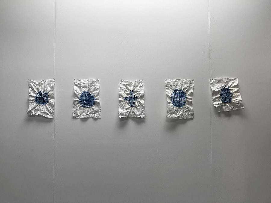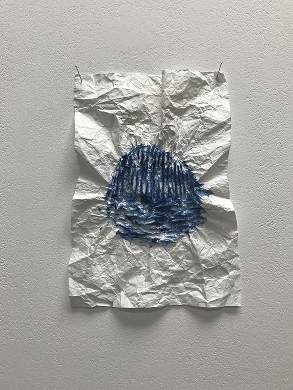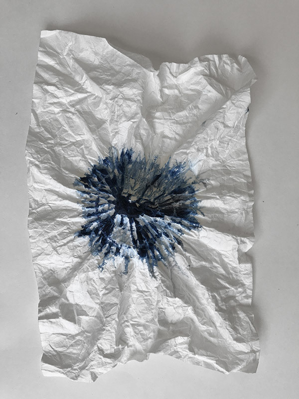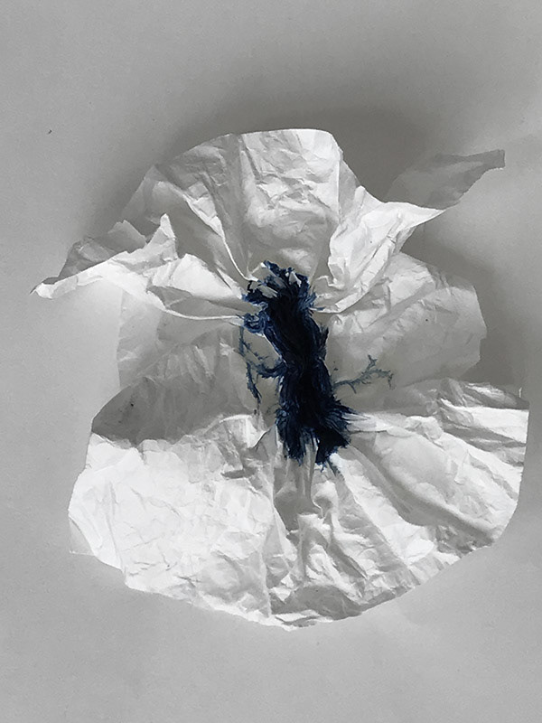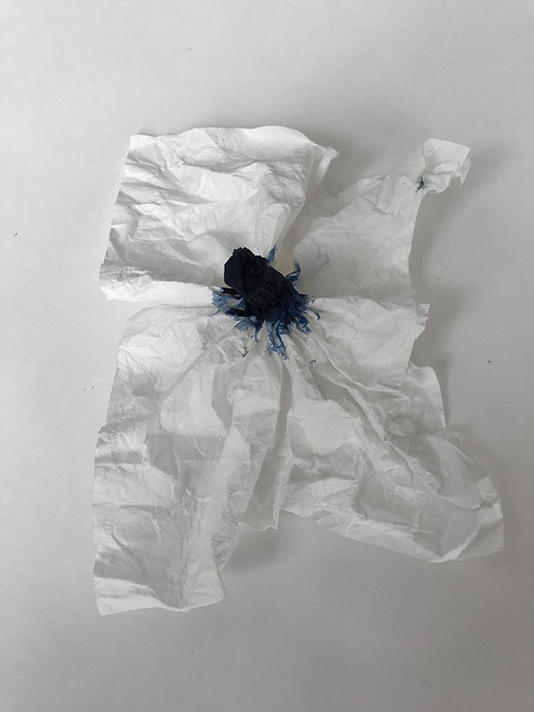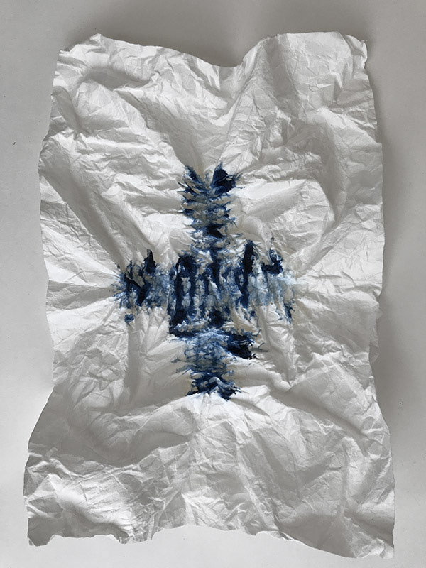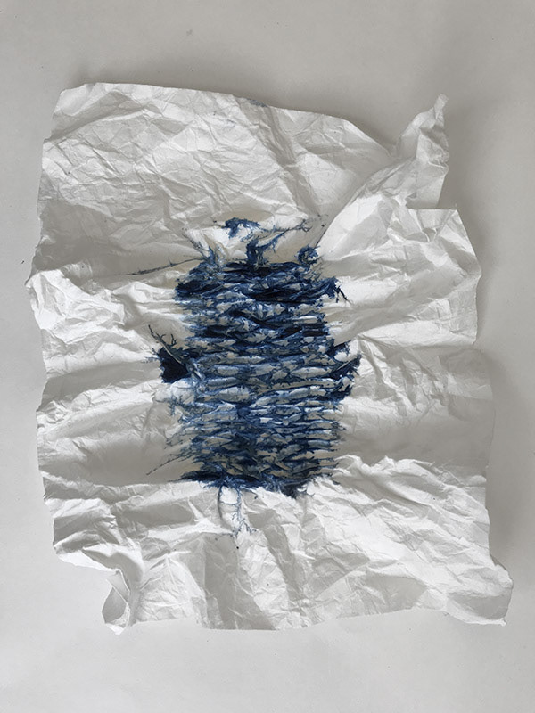 Material exploration using indigo with ink on distressed paper. I wanted to examine the sacred and the discarded in relation to the colonial production of indigo in the Americas and the Caribbean. Inspired by symbols found on the Adire cloth of Nigeria, I created work which spoke both of fragility and great strength.