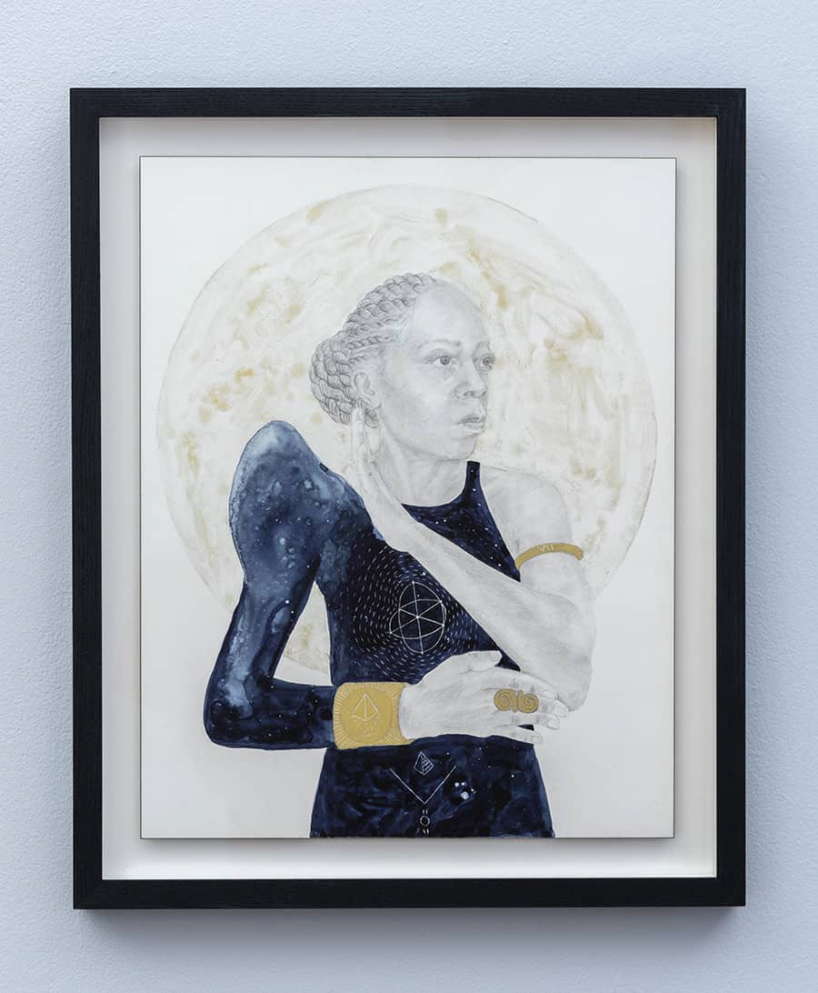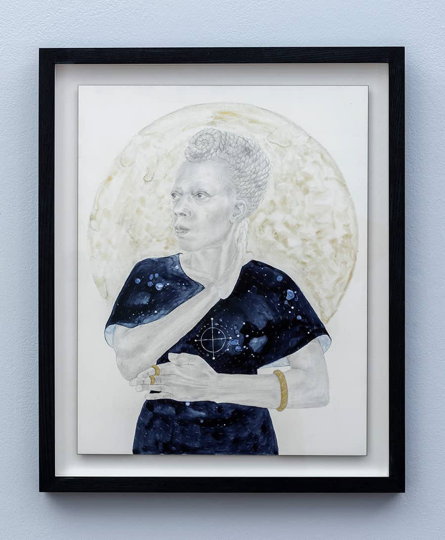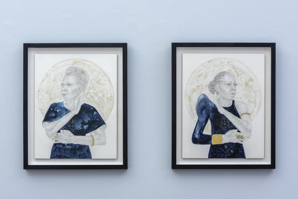 The use of material often plays a part in the stories I want to tell. Working on a clay surface enabled me to express the idea of being between worlds. These panels are coated with Kaolin Clay which are often used as a substance on African masks because white is a colour which represents the world of the unseen. I wanted the women in these claybord panels to be almost like threshold guardians of the universal realm.